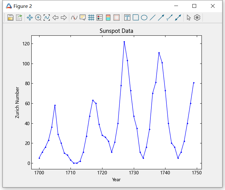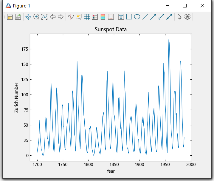 可以使用傅里叶变换来分析数据中的变化,例如一个时间段内的自然事件。下面的代码是天文学家使用苏黎世太阳黑子相对数对大约 300 年的太阳黑子的数量和大小进行统计,定对大约 1700 至 2000 年间的苏黎世数绘图。