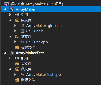使用 Visual Studio 创建 C++ 工程,其中包括 2 个项目 :ArrayMaker(算法项目)、ArrayMakerTest(测试项目),工程配置如下: