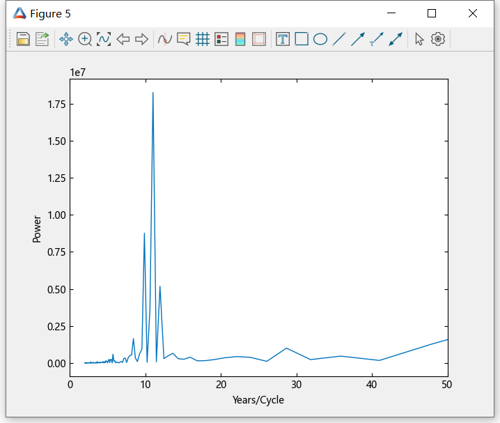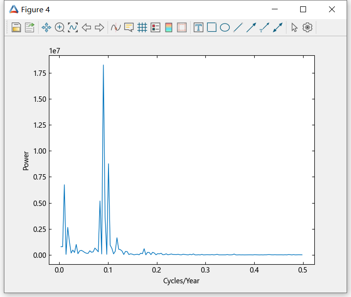 单独的傅里叶系数难以解释。计算系数更有意义的方法是计算其平方幅值,即计算幂。由于一半的系数在幅值中是重复的,因此您只需要对一半的系数计算幂。以频率函数的形式绘制功率谱图,以每年的周期数为测量单位。