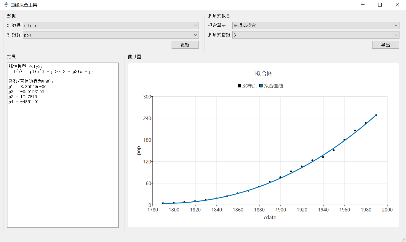 本案例为使用 C++/Qt 图形应用开发环境开发的曲线拟合 APP。该 APP 分析了从 1790 到 1990 年间人口统计数据,通过多项式拟合算法预估未来的人口增长趋势。该案例文件路径为:<Syslab安装路径>\Examples\10 AppDemos\cpp\。