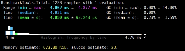 利用 BenchmarkTools 库提供的 @btime 宏对测试用例进行性能测试并对比结果。