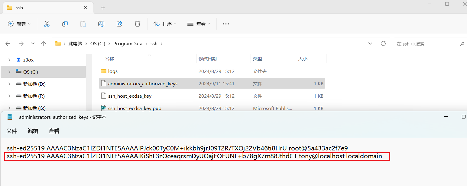 将公钥内容拷贝至 Windows 主机的 C:\ProgramData\ssh\administrators_authorized_keys 文件中,若 administrators_authorized_keys 文件不存在,需要手动创建。