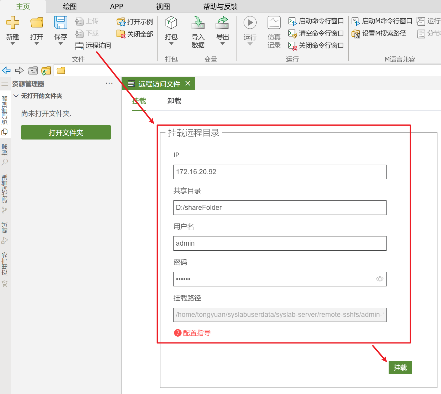 进入 Ribbon 菜单>主页>文件>远程文件按钮打开远程访问文件页面,输入远程 PC 的 IP、共享目录、用户名及密码,保证远程 PC 网络连接正常且 IP 可访问的状态下单击挂载按钮即可实现远程挂载。