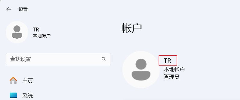 设置>账户 里显示的为用户名(例如:TR 为用户名)。