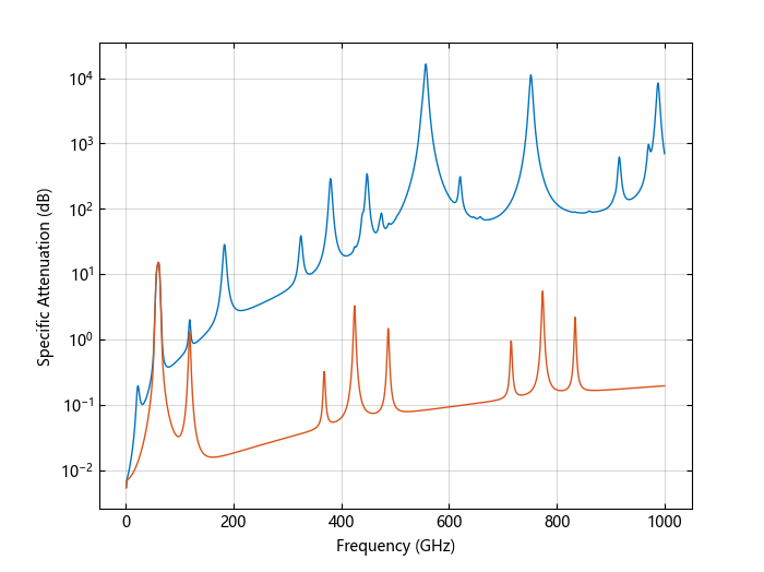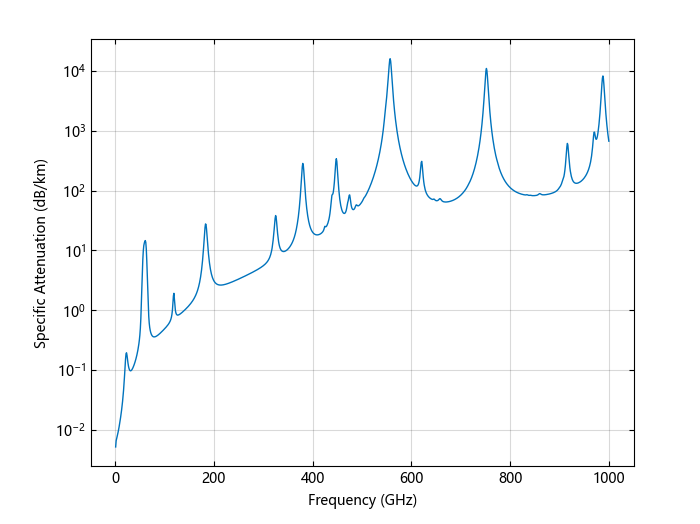 首先,绘制频率为 1 GHz - 1000 GHz 的大气气体的特定衰减。假设海平面干气压为 101.325e5 kPa,水蒸气密度为7.5