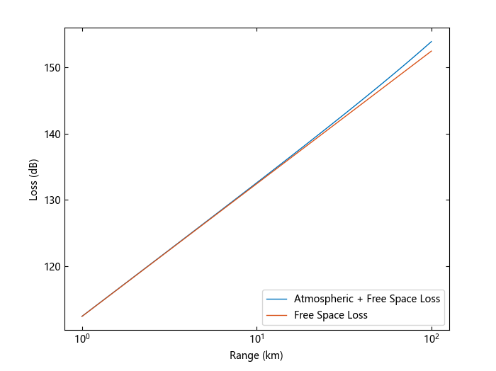 legend(["Atmospheric + Free Space Loss", "Free Space Loss"], loc="southeast")