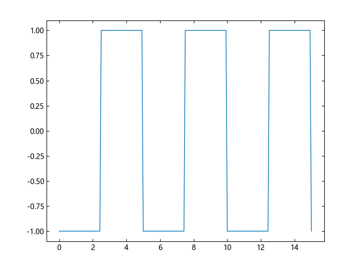 gensig 返回一个单位振幅的方波,从零开始。可以修改 u 来得到一个具有不同振幅和不同端点的方波。创建一个周期为 5 的方波,持续 15 秒,并在 -1 和 1 之间切换。