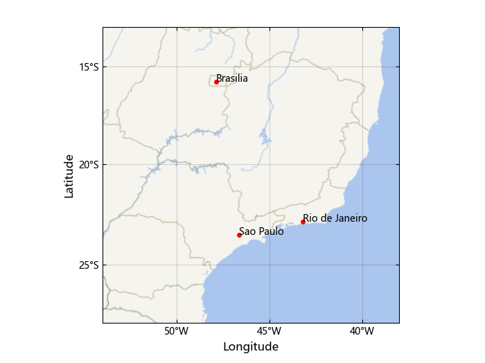 geotext(lat, lon, ["Sao Paulo","Rio de Janeiro","Brasilia"])
