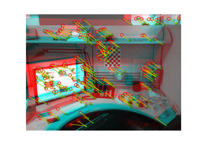 可视化对应点。尽管存在一些错误匹配,你可以看到两幅图像之间的位移效果。