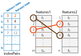 输入特征集之间对应特征的索引,以 P×2 矩阵的形式返回 P 个索引对。每个索引对对应于 features1 和 features2 输入之间的匹配特征。第一个元素索引 features1 中的特征,第二个元素索引 features2 中的匹配特征。