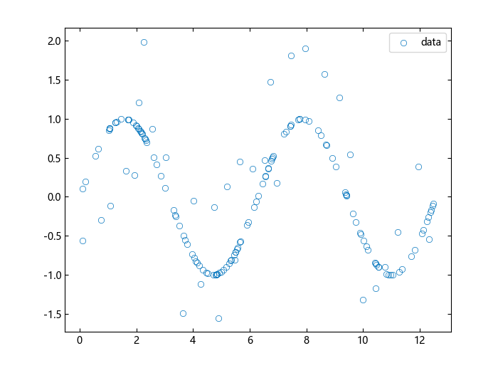 加载数据集,get_datapoly()获取到X_train, X_test, y的数据,样本输入变量X_train,X_test为区间[0,4pi]之间的随机点,对应的响应变量y为加入噪声干扰的正弦函数。读取数据集并可视化。