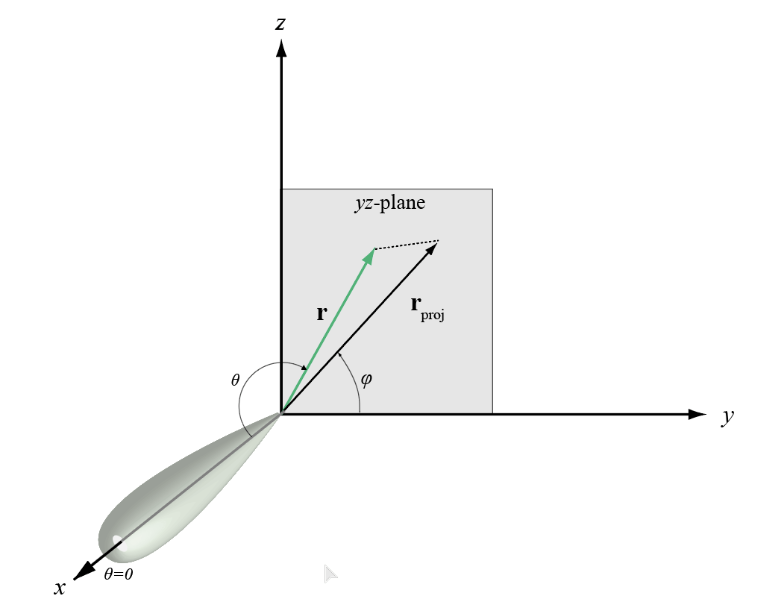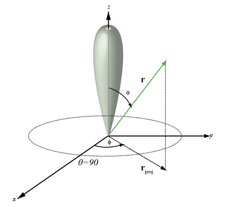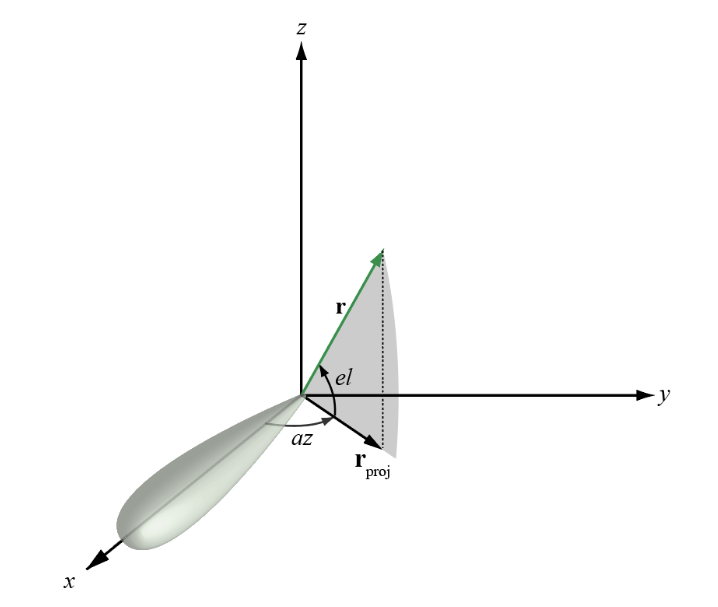 向量的方位角是 x 轴和向量在 xy 平面上的正交投影之间的角度。从 x 轴到 y 轴的角度是正的。方位角介于 –180 度和 180 度之间。仰角是向量与其在 xy 平面上的正交投影之间的角度。从 xy 平面朝向正 z 轴时,角度为正。默认情况下,元素或阵列的轴线方向与正 x 轴对齐。瞄准线方向是元件或阵列的主瓣的方向。