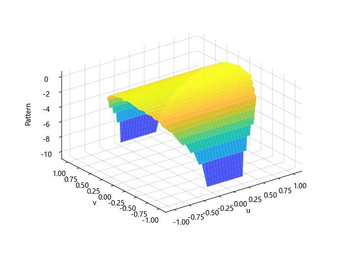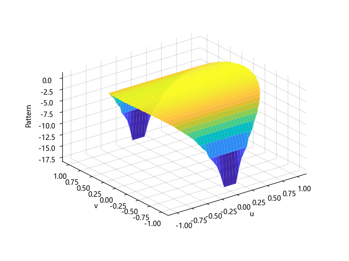 pat_uv = azel2uvpat(pat_azel, az, el, u, v) 使用向量 u 和 v 来指定 pat_uv 的采样网格。为避免插值误差,u 应覆盖 [-1, 1] 范围,v 应覆盖 [-1, 1] 范围。示例