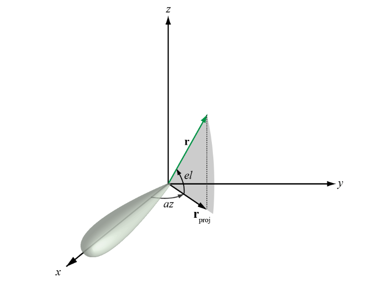 向量的方位角是 x 轴与向量在 xy 平面上的正投影之间的夹角。从 x 轴到 y 轴的角度为正。方位角介于 -180 和 180 度之间。仰角是向量与其在 xy 平面上的正投影之间的夹角。从 xy 平面向 z 轴正方向移动时,仰角为正。默认情况下,元素或阵列的孔径方向与正 x 轴对齐。孔径方向是元素或阵列主叶的方向。