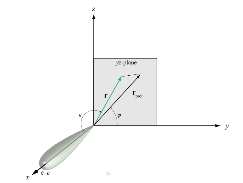phi 角 (φ) 是正 y 轴与向量在 yz 平面上的正交投影之间的夹角。该角度对正 Z 轴为正。phi 角介于 0 和 360 度之间。Theta 角 (θ) 是 x 轴与向量本身的夹角。该角度朝向 yz 平面为正。Theta 角介于 0 和 180 度之间。