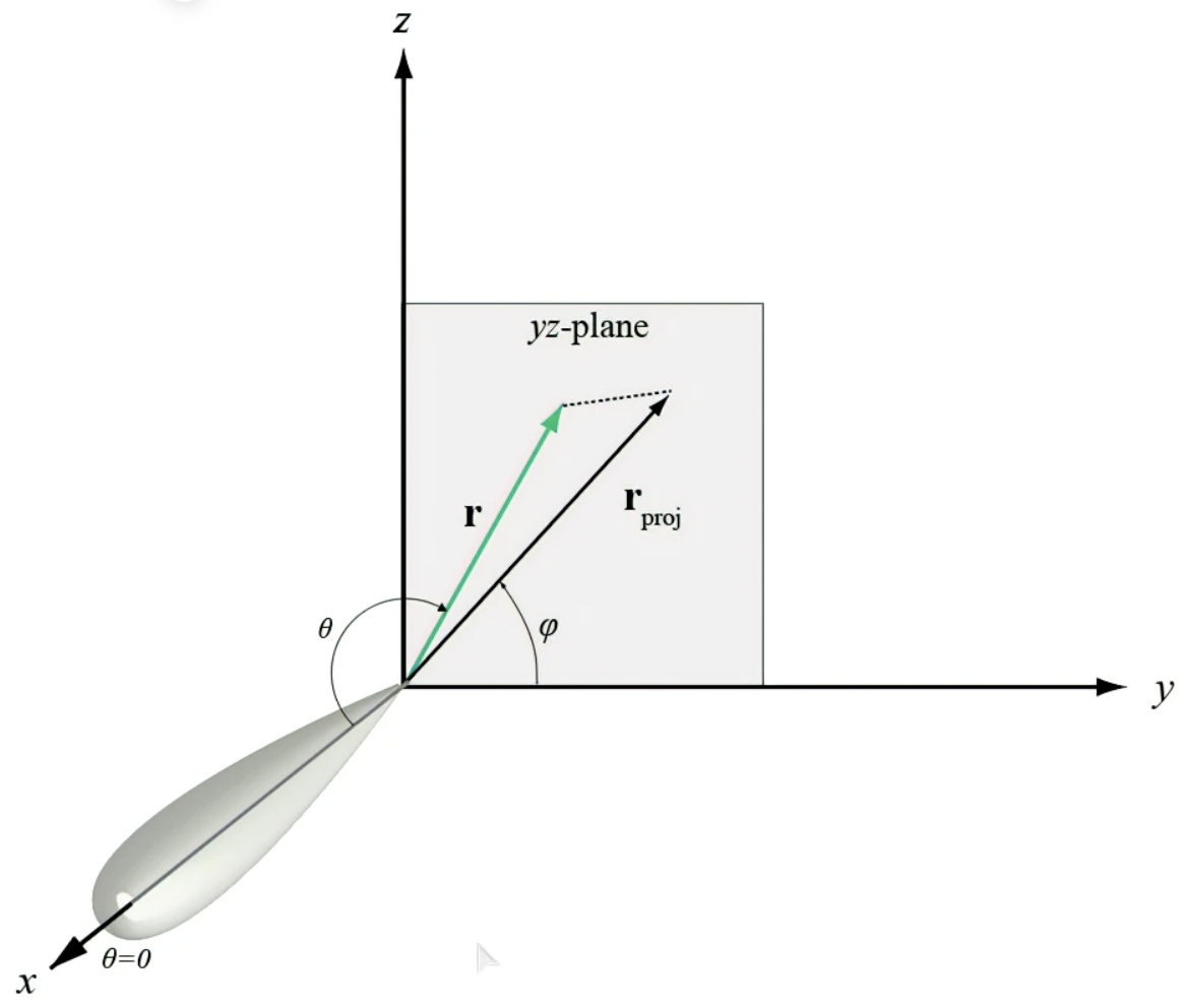 图中说明了一个向量的 phi 和 theta,该向量显示为绿色实线。