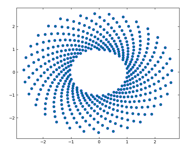 在创建散点序列后,使用 s 查询并设置其属性。将线宽设置为 0.6 磅。将标记边颜色设置为蓝色。使用 RGB 三元组颜色设置标记面。