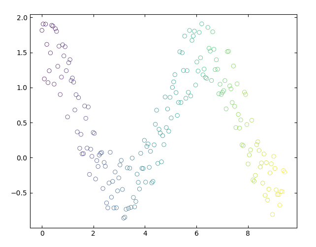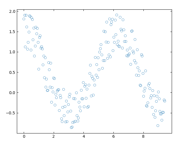 创建向量 x 和 y,作为带随机干扰的正弦和余弦值。创建一个散点图并设置标记边颜色、标记面颜色和线条宽度。