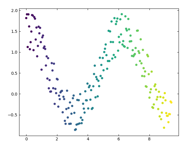 x、y 和 c 中的相应元素确定每个圆形的位置和颜色。scatter 函数将 c 中的元素映射到当前颜色图中的元素。