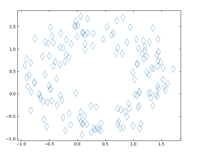 创建向量 x 和 y,作为带随机干扰的正弦和余弦值。然后,创建一个散点图,并使用面积为 140 平方磅的菱形标记。
