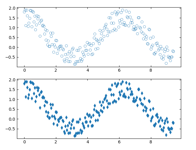 调用 subplot 函数以创建一个 2×1 分块图布局和一个坐标区对象 ax1 和 ax2 。将在每个坐标区中绘制散点数据。在底部散点图中,指定使用实心菱形标记。