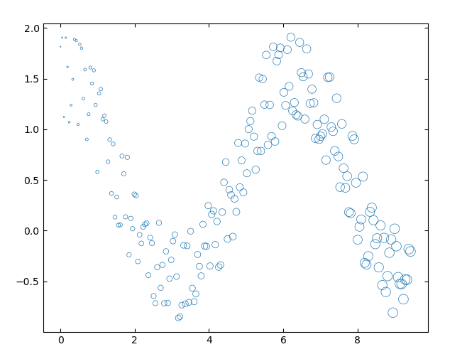 scatter(X,Y,s) 指定圆大小。要绘制大小相等的圆圈,请将 s 指定为标量。要绘制大小不等的圆,请将 s 指定为长度等于 x 和 y 的长度的向量。示例