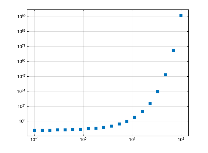 loglog(x, y, "s"; markerfacecolor=[0, 0.447, 0.741])