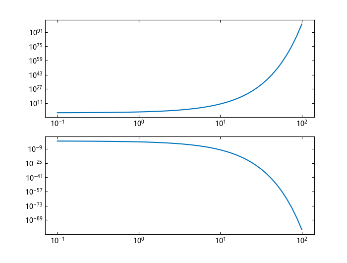 调用 subplot 函数以创建一个 2×1 分块图布局和一个坐标区对象,以便坐标区填充布局中的可用空间。接下来,将该对象返回为 ax1。通过将 ax1 传递给 loglog 函数来显示一个双对数图。