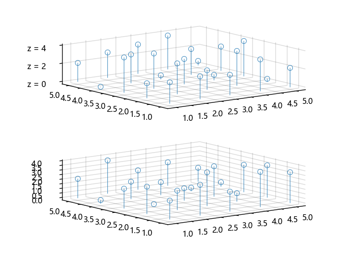 调用 subplot 函数以创建一个 2×1 分块图布局和一个坐标区对象,并将该对象返回为 ax1。通过将 ax1 传递给 stem3 函数来创建顶部绘图。重复该过程以创建底部绘图。在每个坐标区中绘制数据。将随机数据绘制到每个坐标区中。然后通过将 ax2 指定为第一个输入参数,设置第二个图的 z 轴刻度值和标签。