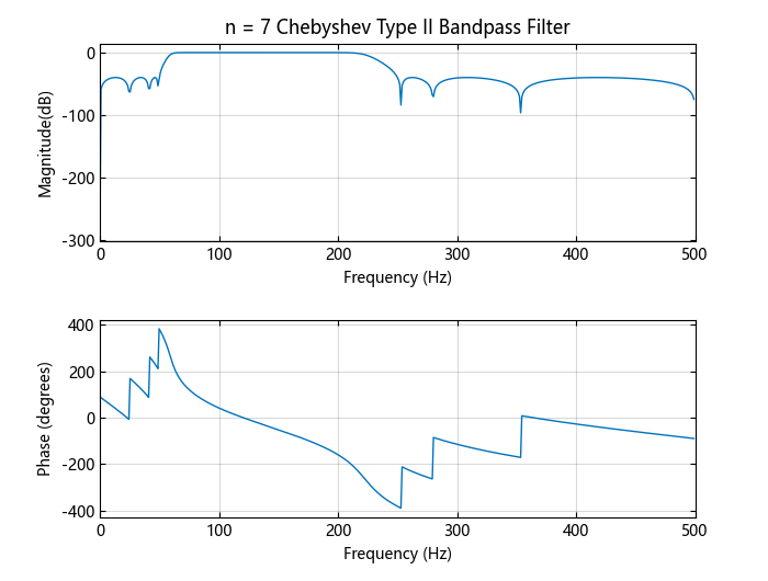 title("n = 7 Chebyshev Type II Bandpass Filter")