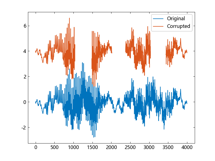 模拟嘈杂的传输信道不可逆转地破坏了部分信号的情况。大约每 500 个样本引入一个随机长度的间隙。重置随机数发生器,以获得可重复的结果。