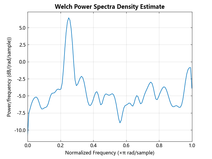 获得 Welch PSD 估计,将信号分为 132 个样本长度的片段。信号段被乘以长度为 132 个样本的汉明窗。没有指定重叠样本的数量,所以它被设定为 132/2 = 66。DFT 长度为 256 点,产生的频率分辨率为 2π/256 rad/sample。因为信号是实值的,所以 PSD 估计是单边的,有 256/2+1 = 129 个点。将 PSD 绘制成归一化频率的函数。