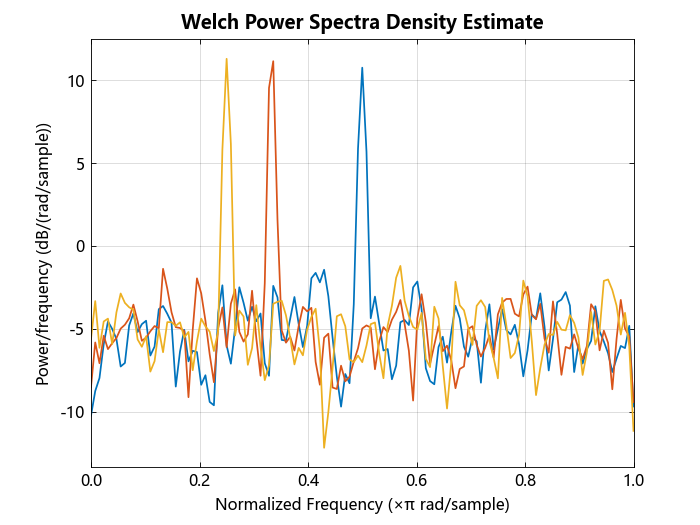 生成由加性 N(0,1) 高斯白噪声中的三个正弦曲线组成的多通道信号的 1024 个样本。正弦曲线的频率分别为 π/2、π/3 和 π/4 rad/sample。使用韦尔奇方法估计信号的 PSD 并绘制它。