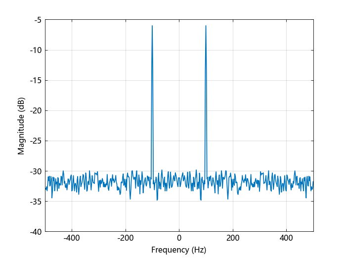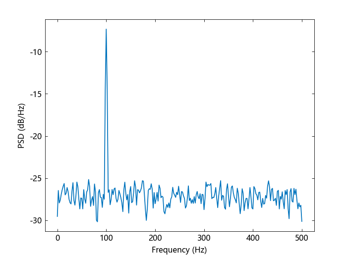 你可以看到,在 -100 和 100 Hz 的功率接近于振幅为 1 的实值正弦波的预期功率 1/4,与 1/4 的偏差是由于加性噪声的影响。