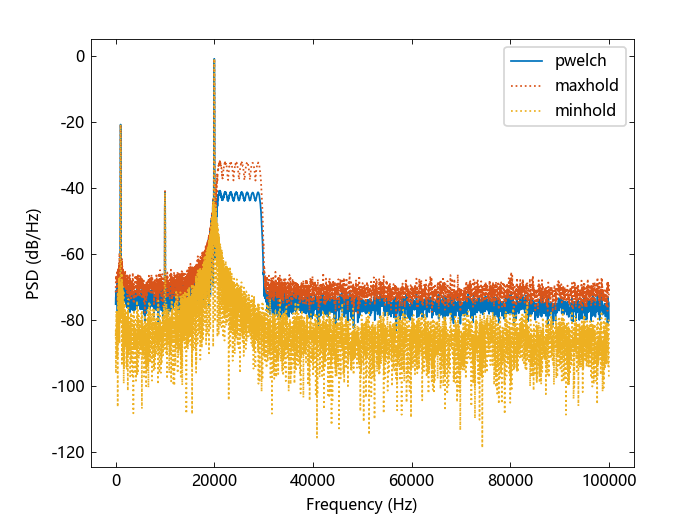 "maxhold" - 返回每个输入通道的最大保持频谱。ty_pwelch 通过保持所有部分功率谱估计值中的最大值来计算每个频率间隔的最大保持频谱。