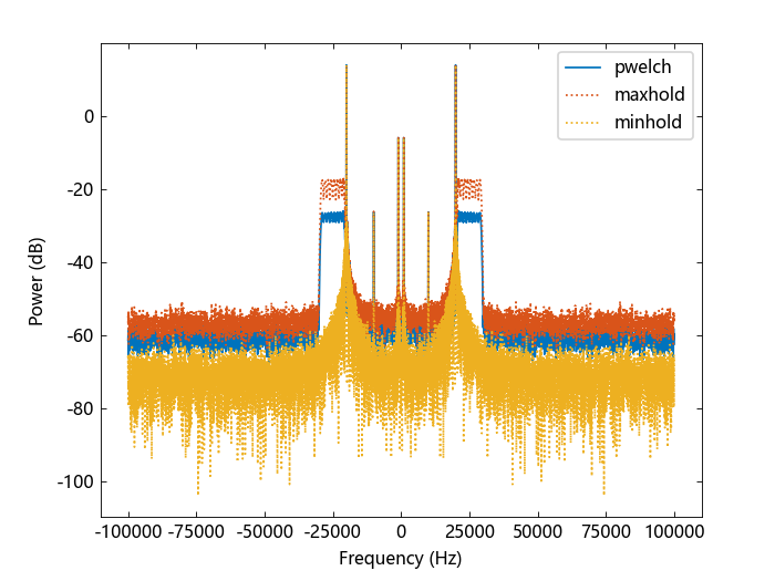 ___ = ty_pwelch(___; trace = String) 如果 trace 被指定为 "maxhold",则返回最大保持谱估计值;如果 trace 被指定为 "minhold",则返回最小保持谱估计值。
