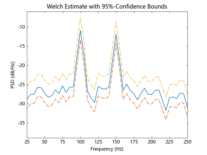 ___, pxxc = ty_pwelch(___; conflevel = Real) 返回 pxxc 中 PSD 估计值的 conflevel × 100% 置信区间。