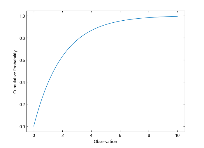 通过指定参数值 (Exponential) 创建概率分布对象 ExponentialDistribution。 然后,使用对象函数来评估分布、生成随机数等。