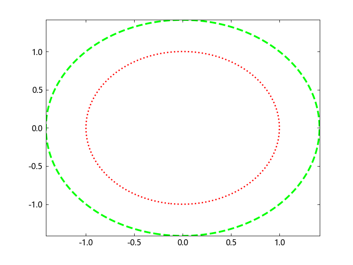 使用不同的半径值绘制两个以 (0,0) 为中心的圆。第一个圆使用红色点线。第二个圆使用线宽为 2 磅的绿色虚线。