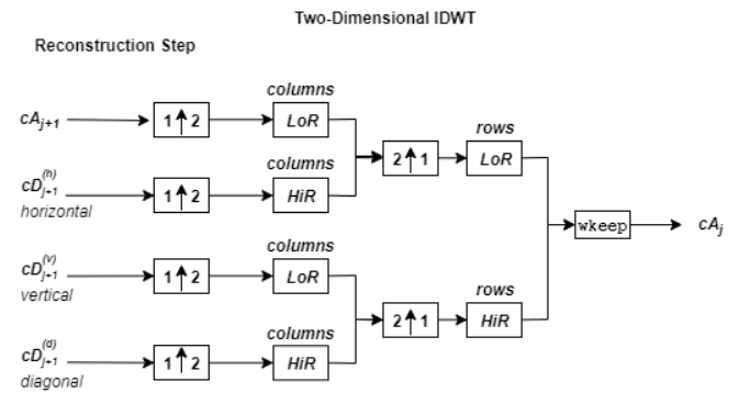 图像的二维小波重构算法与一维情况类似。二维小波和标度函数由一维小波和标度函数的张量积得到。这种二维逆DWT导致从四个分量重建j层的近似系数:j+1层的近似,以及三个方向(水平、垂直和对角线)的细节。下图描述了图像的基本重建步骤。