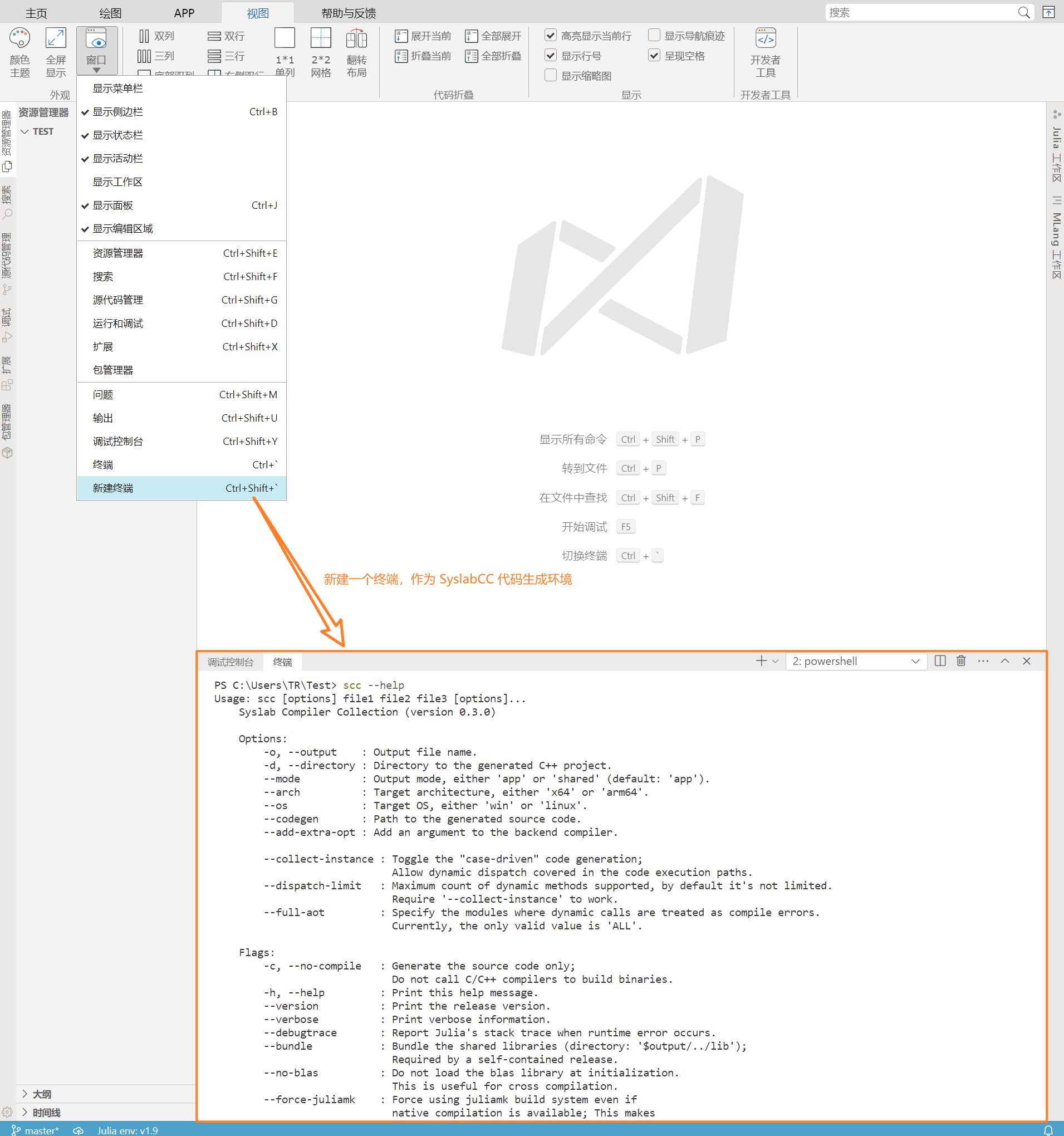 在 Syslab 中,点击【视图>窗口>新建终端】工具栏菜单,即可新建一个终端,作为 SyslabCC 代码生成环境。