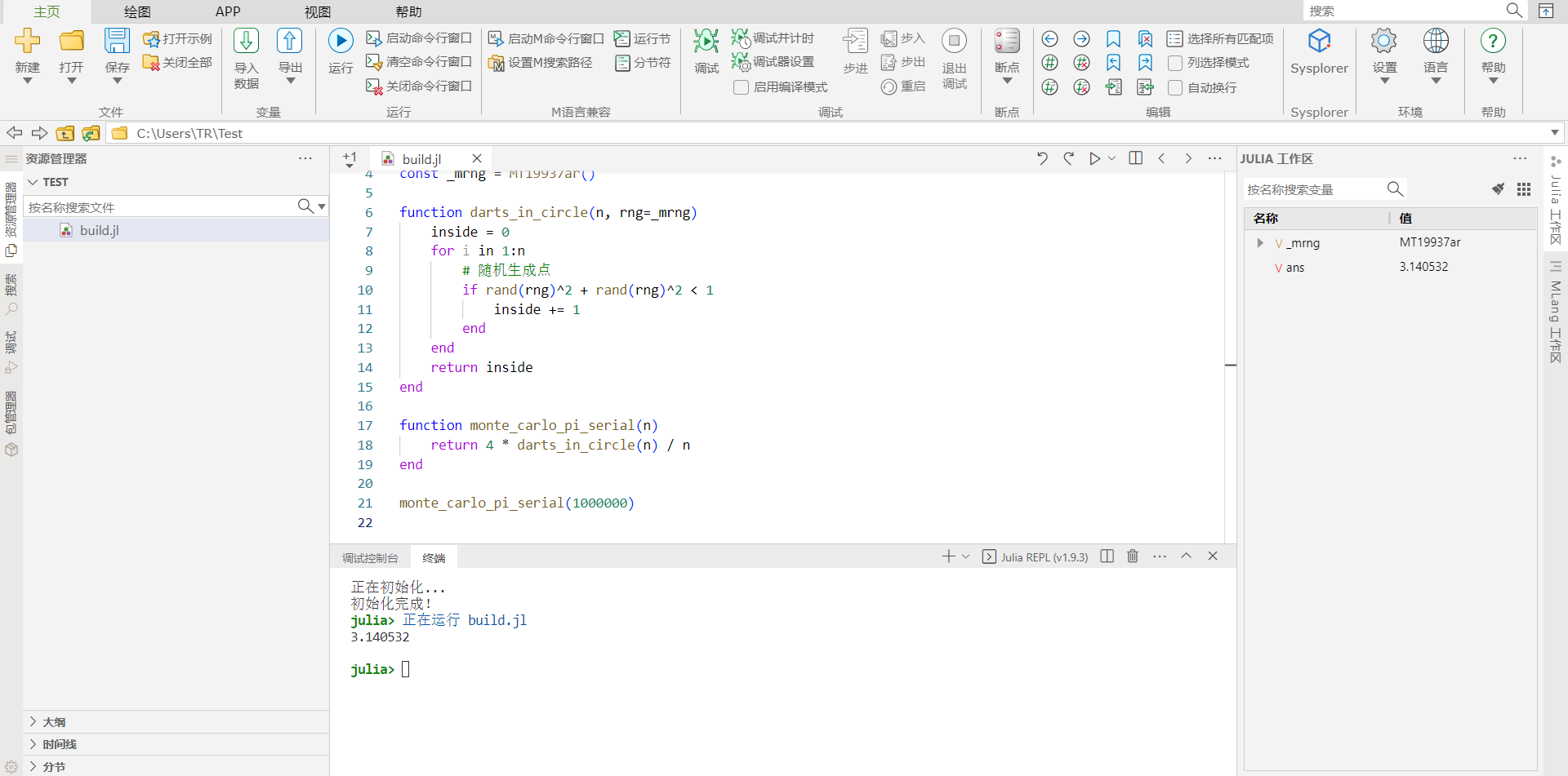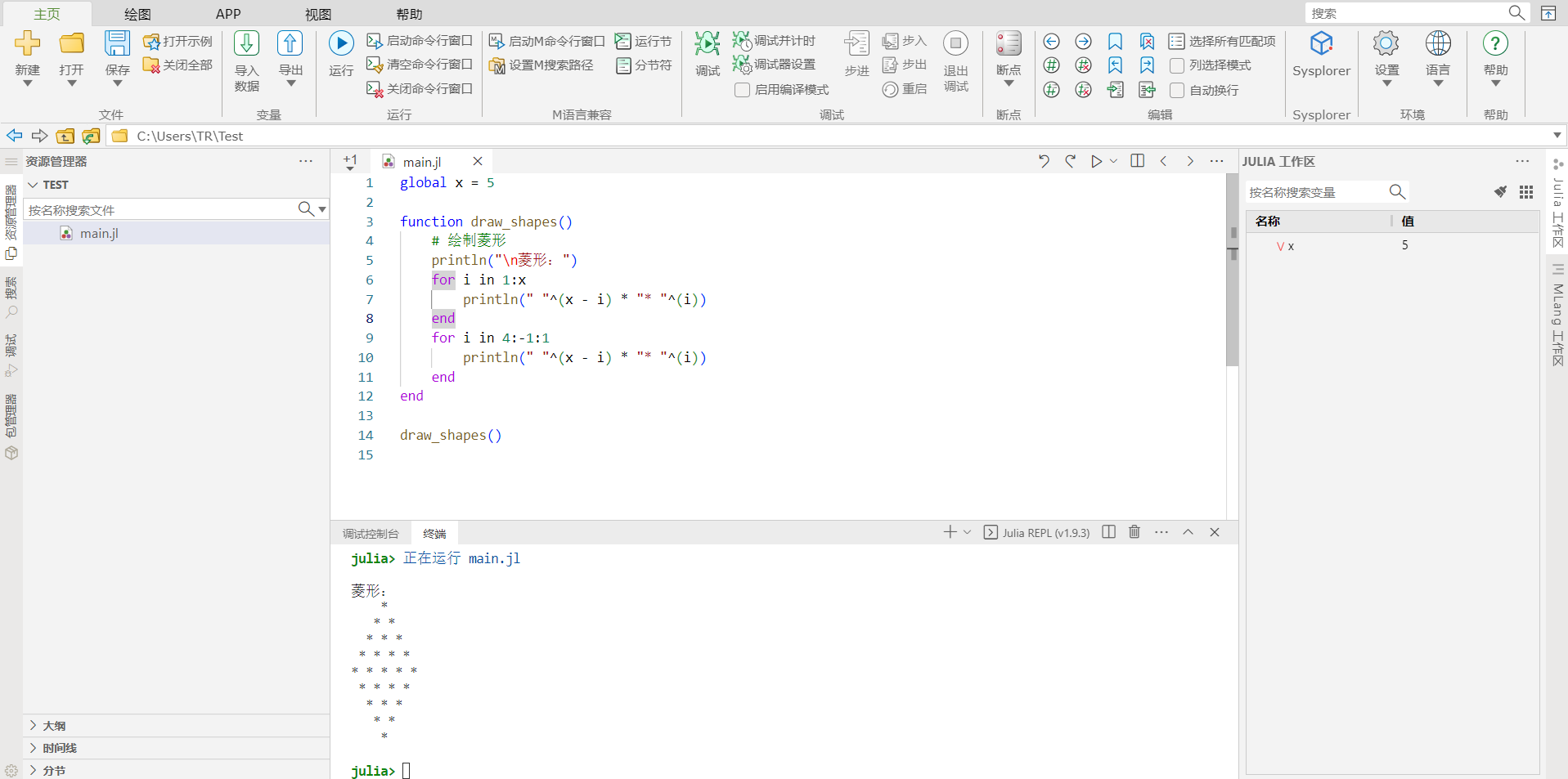 新建 main.jl 输入以下代码,此代码主要为演示工作流使用: