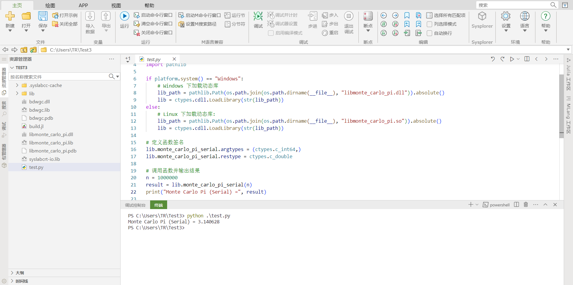 此处演示使用蒙特卡洛方法计算 monte_carlo_pi_serial 函数,并将其导出为动态库,然后使用 Python 调用生成的动态库来测试。