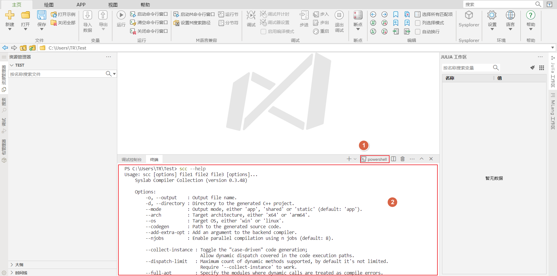 打开 Syslab,打开工作文件夹,此处演示以 Test 文件夹为例: