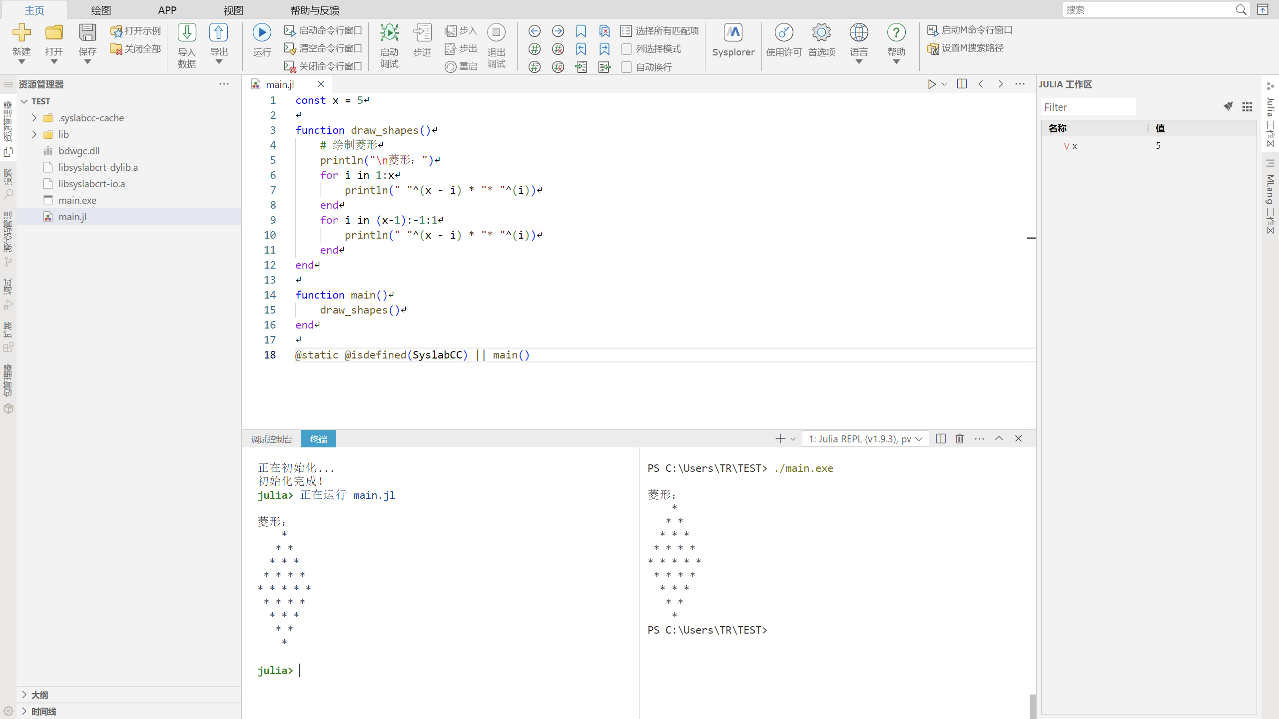 此处演示生成可执行文件,将 main.jl 生成为 main.exe ,预期执行生成的 main.exe 二进制文件可得到与 Julia 代码运行类似的输出。