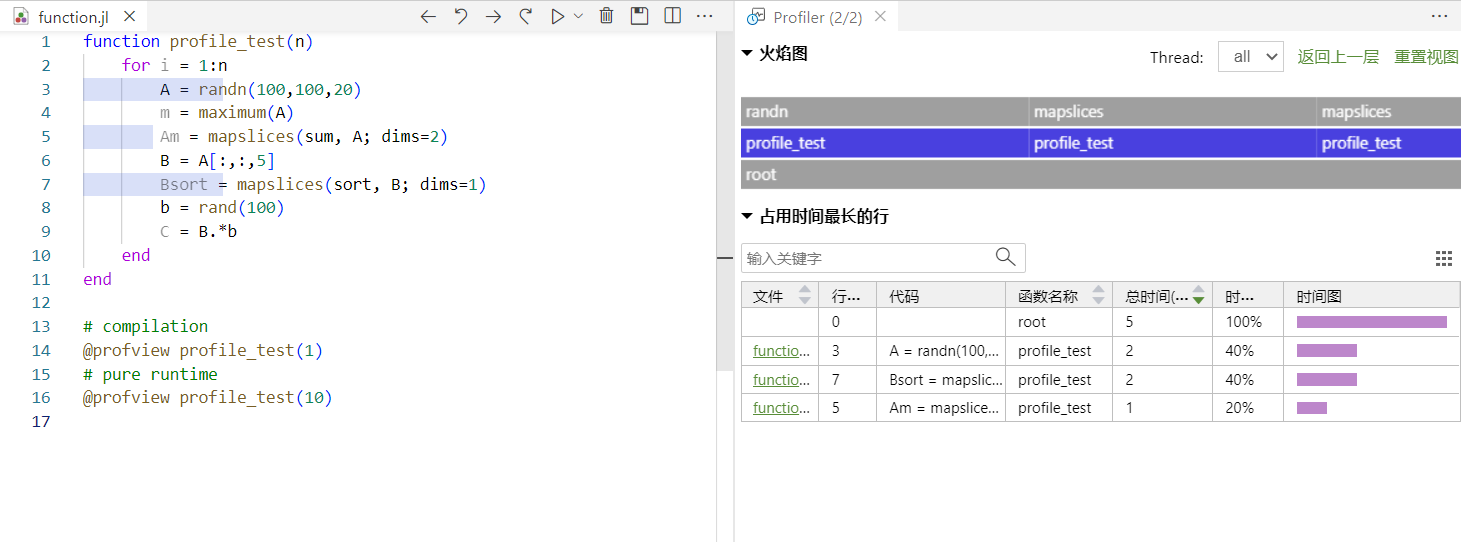 @profview宏以可视化的方式将性能采样结果与代码行绑定在一起