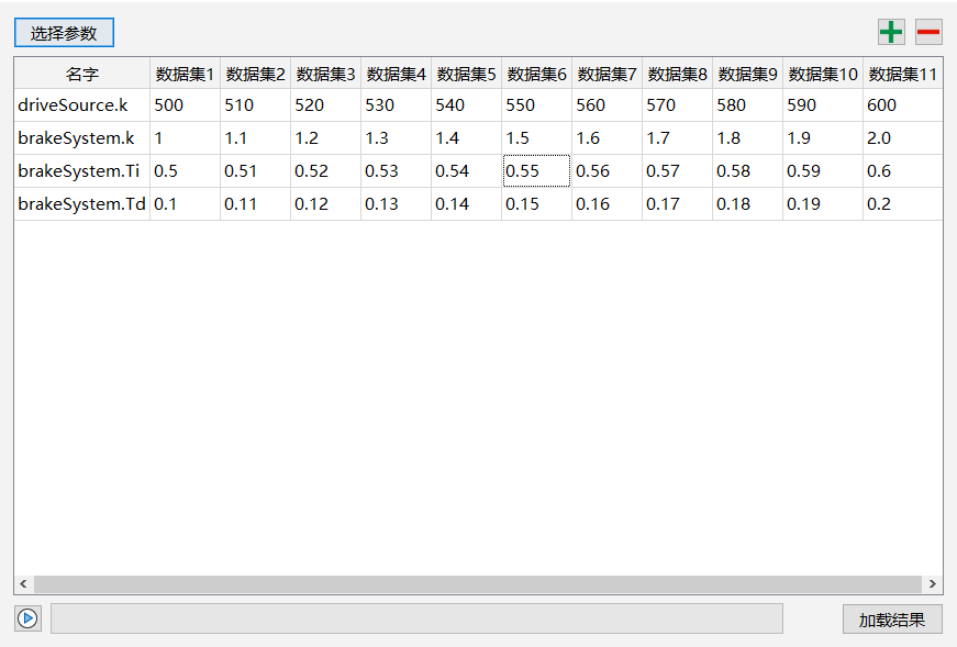 首先单击选择参数,在弹出的面板中选择需要批量仿真的参数集合,然后单击“+”添加数据集,接着修改数据集并单击开始批量仿真按钮,待进度条到达 100% 后,单击加载结果按钮,将批量仿真的结果加载到 MWORKS 结果面板。