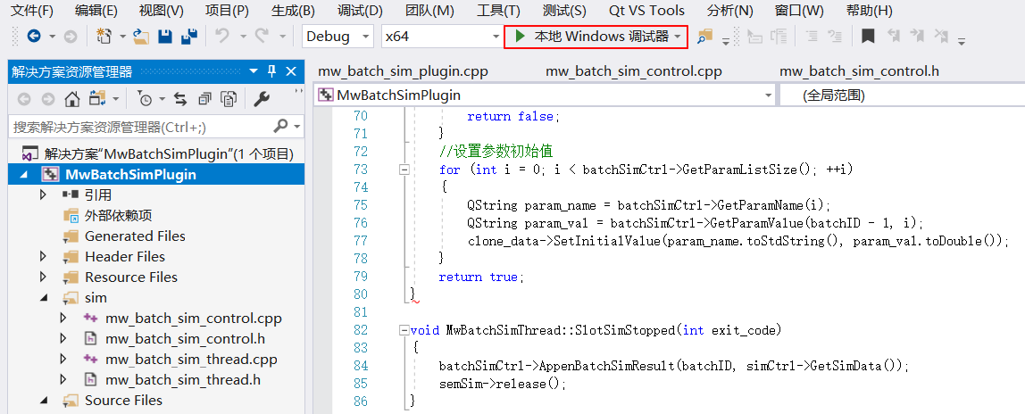 bool MwBatchSimPlugin::initialize(QString *errorString) { MwWorkbench *work_bench = MwAppPtr->GetWorkbench(); work_bench->AddActionToToolBar(actionBatchSim); return true; } void MwBatchSimPlugin::extensionsInitialized() { }单击批量仿真按钮时,会触发槽函数 SlotShowBatchSimDlg,槽函数中获取 MWORKS 当前模型键值并依赖模型编译结果构造 MwSimData 对象,以此创建批量仿真对话框 MwBatchSimDialog。MWORKS 相关的对象均借由 MwAppPtr 获取,它的定义位于 MwAPP(MWORKS 应用程序对象)中。