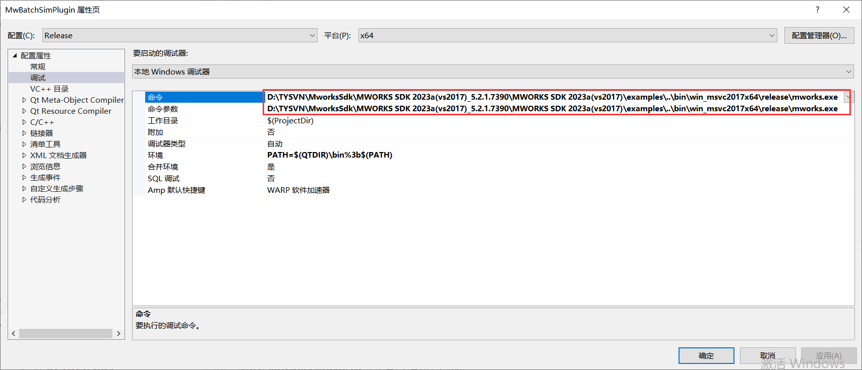 右击项目>属性>调试>命令/命令参数传入 mworks.exe 的路径,这里使用 SDK 下自带的mworks.exe进行调试。