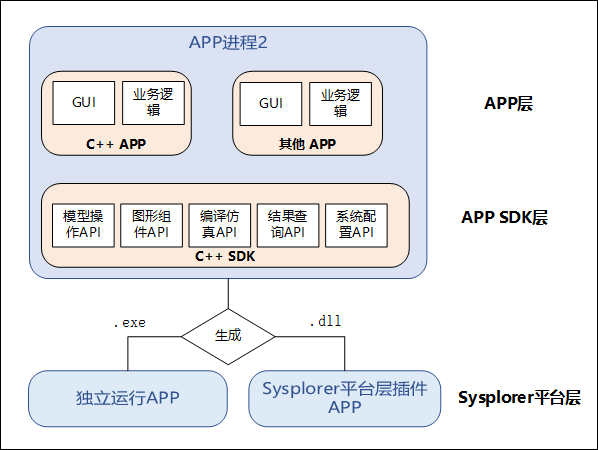 Sysplorer 层:若将 APP 编译成 exe 类型,则可直接独立运行,若将 APP 编译成 dll 类型,并在插件中增加该工具,可依赖 Sysplorer 环境进行使用和打开。